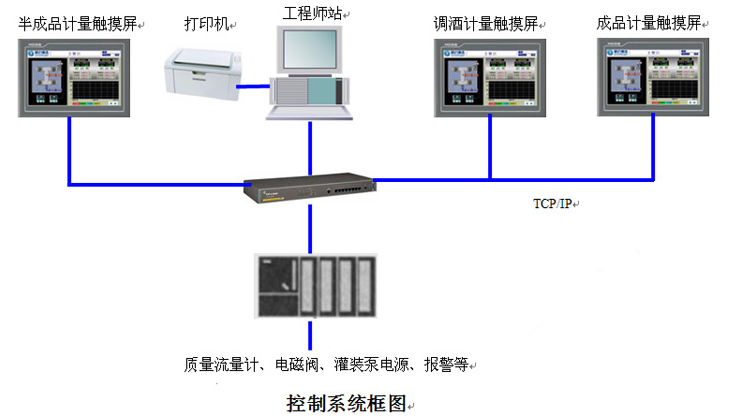 系統概述 隨著工業化發展的浪潮,相應的提高白酒生產的自動化水平就成為當前亟待解決的問題,據此本文設計白 酒勾調生產自控系統,對白酒生產勾兌環節進行全面的自動化控制。系統設計為以西門子S7-300系列PLC為核心的現場總線控制系統。通過人機界面的設計實現了對現場設備的實時監控。最終實現了計算機通訊、控制、顯示、管理技術與相關的生產工藝過程有機結合,管理系統可記錄酒體相關信息包括:品種、體積量、質量、酒度、液位高度、進罐時間、存罐時間、液位變化曲線等信息;保證了對酒的流量、勾兌純水的流量、罐體之間倒酒量、各罐進酒量的精確計量和精確控制。