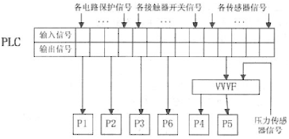 因為變頻器具有短路、過載等保護功能,所以當(dāng)前變頻器所驅(qū)動的水泵發(fā)生上述故障時變頻器將自動切斷一次供電回路,進入保護狀態(tài)并輸出報警信號。PLC對這些報警信號進行檢測,而后進行備用水泵的投入。具體過程為PLC檢測到報警信號后首先分?jǐn)喈?dāng)前水泵的接觸器,后對變頻器復(fù)位,然后接通備用水泵的接觸器,啟動變頻器運行備用水泵。同時輸出該泵故障報警信號。
